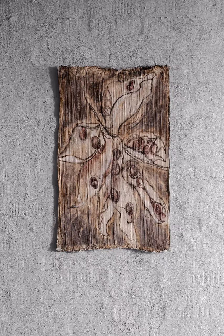 К теме скрытой силы и двойственности обращается и Татьяна Подмаркова. В её новой серии мотив ядовитых цветов соединяет декоративность и угрозу: найденное изображение олеандра из старого ботанического атласа становится основой для живописных полотен, в которых фактурные материалы и бинты создают ощущение древнего, окаменевшего холста. Здесь красота оборачивается тревогой, а соблазнительное очарование природы — напоминанием о её разрушительной стороне.